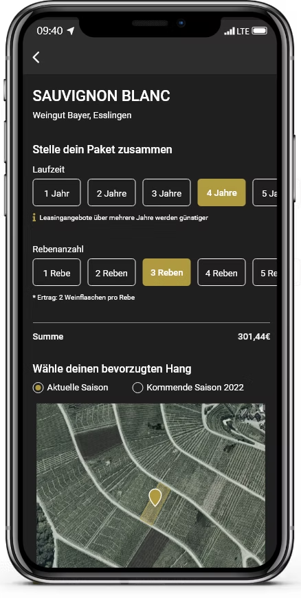 Ein übersichtliches Interface ermöglicht es dem Kunden, den geleasten Wengert jederzeit zu begutachten und relevanten Content zu seinen Reben abzurufen.